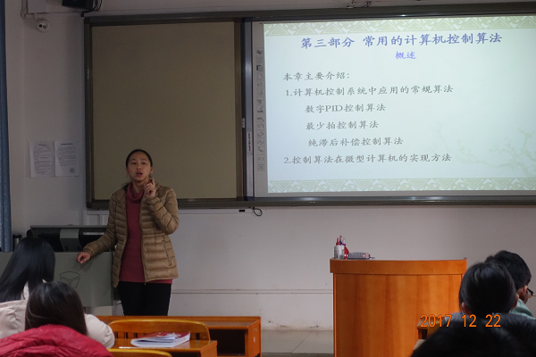 授课过程中,高远老师围绕动态系统的内、外部稳定性,李雅普诺夫判稳第一、二方法及其在线性系统中的应用等内容,对控制系统的进行了稳定性分析;李振强老师围绕实时数据报表和历史数据报表,详细讲解了两种报表的创建、打印、查询、刷新及其他应用;石玉秋老师围绕数字PID控制算法,最少拍控制算法,纯滞后补偿控制算法等内容,讲解了计算机控制系中应用的常规算法;李克俭老师围绕C650卧式车床电气控制电路的分析,讲解了PLC控制原理及应用。期间,授课教师通过现场问答的方式,将同学们把握不准、理解不透的问题给与明确答复。