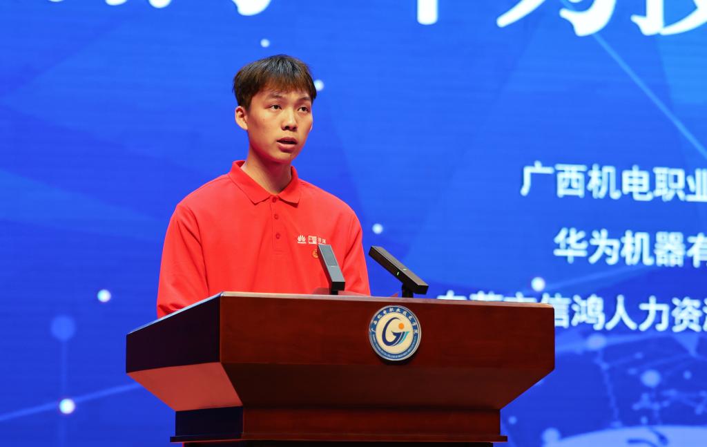 华为机器有限公司人力资源部领导在致辞中表示,广西机电是华为开展校企合作模式中最全面、最深入且最成功的院校之一,学生的综合素质得到各业务部门的高度认可。希望新一届技师班同学们在百年未有之大变局中,紧跟未来,不断探索,磨炼本领,提升技能,努力成为有扎实技术技能的高质量人才。同时,他借引王国维的“人生三境界”,勉励同学们“立”远大目标,坚定技能报国理想信念;“守”住初心,抵制外界诱惑,专心致志完成学业;“成”一番事业,用所学知识成就事业,为中国式现代化贡献青春智慧和力量。
