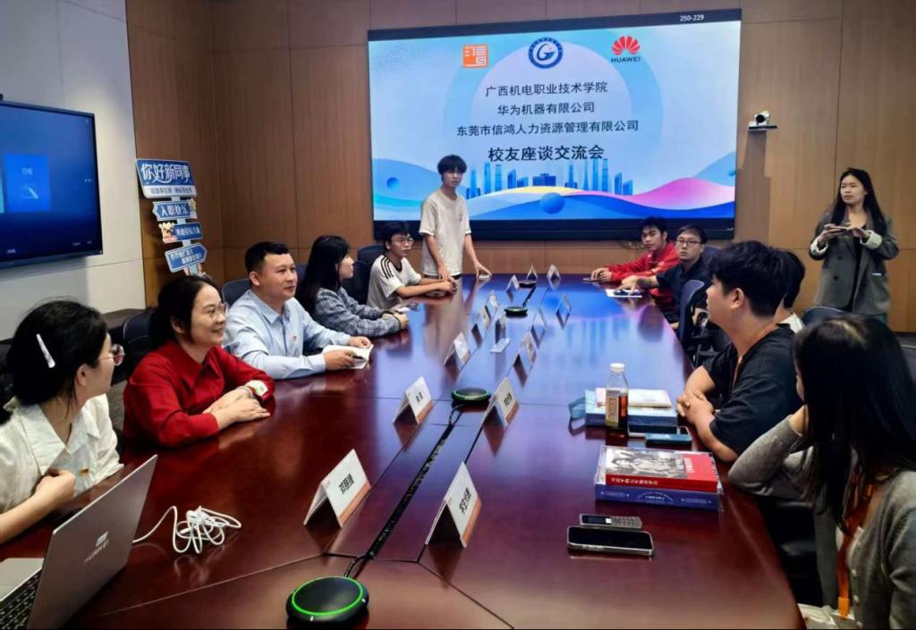 最后,队伍转赴华为团泊洼基地与校友、实习生开展交流活动。多位在华为工作的优秀校友分享了立足本职、深耕专业的实战经验,并勉励学弟学妹夯实基础、勇于实践、主动融入产业变革。2023级实习生代表也结合自身在华为的实习经历,从技能准备、心态调适、团队协作等方面提供了实用建议。同学们就专业学习路径、职业发展方向、技术能力提升等与校友、学长进行了深入地交流探讨。