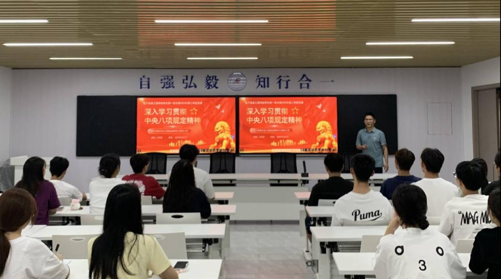 电子信息工程学院学生第一党支部书记吕雪科老师则作了题为《深入学习贯彻中央八项规定精神》的党课暨“青马班”专题学习会。吕雪科老师以“理论阐释-案例警示-互动反思”递进模式展开,梳理八项规定历史背景与核心要义,结合习近平总书记相关论述解读作风建设意义,同时通过剖析作风不正、学术不端、学生干部形式主义等校园典型案例,为团员青年敲响警钟。通过学习和研讨,学员们筑牢思想根基,纷纷表示要从节约、诚信等小事践行,坚定使命担当,在学业竞赛、社会实践、志愿服务中传递清正廉洁的新风正气,书写无愧于时代的青春答卷。