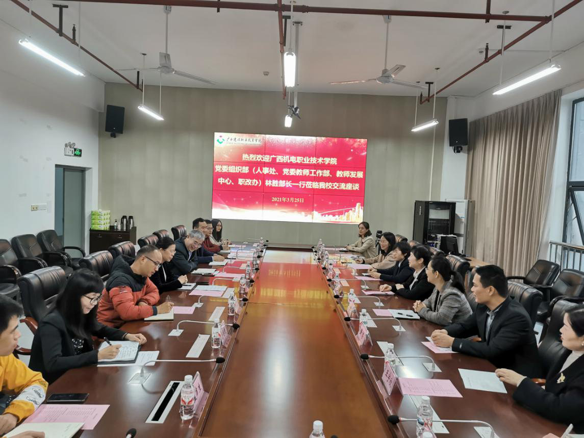 为响应学校党委号召,开阔视野、拓宽思路,学习借鉴兄弟院校基层党建和人事、人才工作先进管理理念和工作经验,3月25日上午,组织部(人事处)林胜副部长(副处长)带队,带领部门全体人员赴广西建设职业技术学院进行考察学习,得到建院组织部(人事处)热情接待,双方进行座谈交流,就基层党组织建设、干部管理、人事管理、师资队伍建设、职称评聘、人员招聘、绩效考核等业务进行了深入探讨与交流,考察组一行还参观了建院的校园建设。