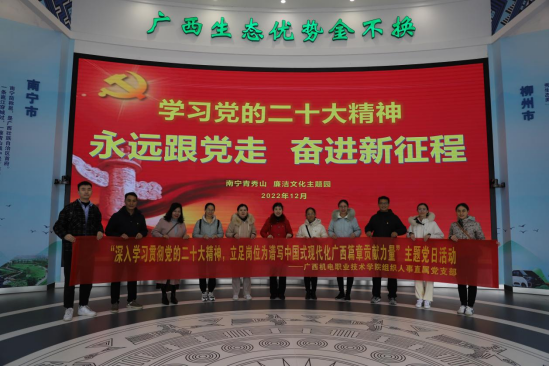 12月3日,组织人事直属党支部、宣传监察审计直属党支部赴青秀山“中国共产党人精神谱系主题园” 和“廉洁文化主题园”联合开展“深入学习贯彻党的二十大精神,立足岗位为谱写中国式现代化广西篇章贡献力量”主题党日活动。