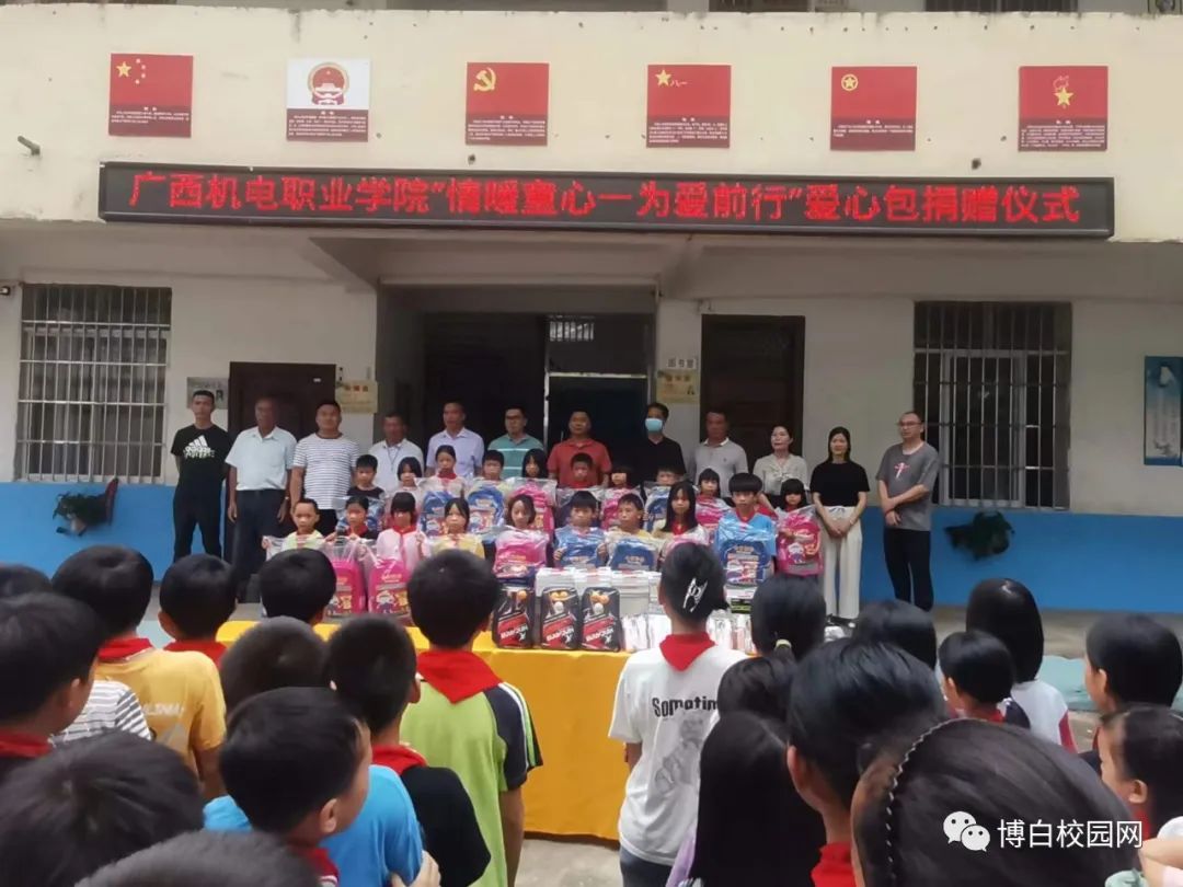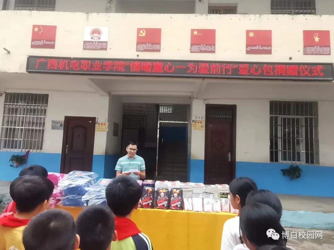 在当天早上,学校举行了简单的捐赠仪式,仪式上,由广西机电职业学院第一书记梁雨中给新丰村小学的留守儿童捐赠学习用品,希望他们努力快乐学习,长大以后能成为国家的栋梁之才,20位留守儿童纷纷上前领取爱心包,个个笑容满面,并下定决心要好好学习,最后,新丰村小学校长陈超对广西机电职业学院表示衷心的感谢。