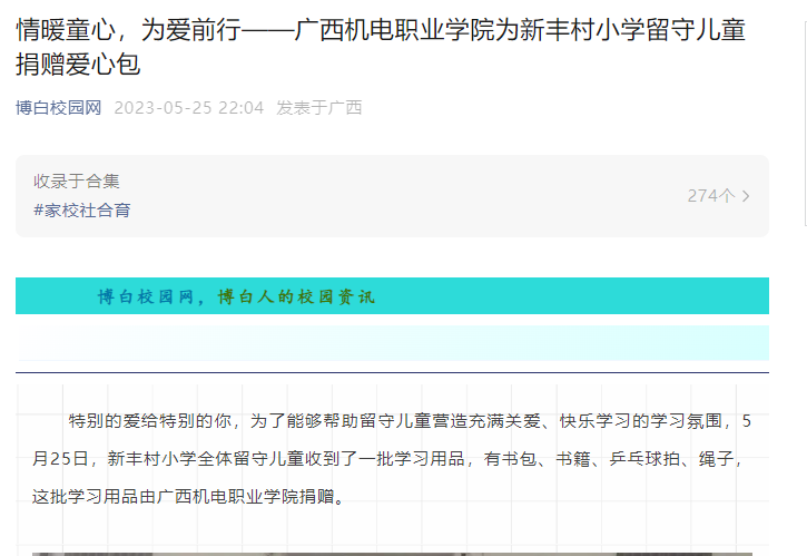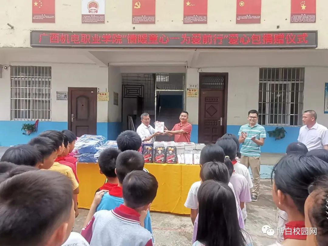 深入学习贯彻党的二十大精神,积极推进第二个百年奋斗目标的实现,助力推进乡村振兴战略实施,加强未成年人的关爱和保护工作,改善未成年人的学习生活环境,促进未成年人的健康快乐成长努力让更多孩子享有高质量更加公平的教育,拥有更多的阅读机会,丰富精神世界,点亮理想。开云对帮扶村开展了“情暖童心,为爱前行”爱心学习包公益捐赠活动。5月25日,博白校园网以《情暖童心,为爱前行——广西机电职业学院为新丰村小学留守儿童捐赠爱心包》为题,报道了开云的“情暖童心,为爱前行”爱心学习包公益捐赠仪式。全文如下: