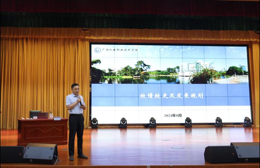 校长吴世先教授以“创新发展向未来——校情校史及发展规划”为题为新教职员工讲授了“机电第一课”,讲述了学校悠久的办学历史、优势与特色、面临的机遇与挑战、未来的发展方向和战略及奋斗目标,并对新教师寄予殷切期望。他强调学校根据广西实施新一轮工业振兴三年行动已完成了新一轮的谋篇布局,正式迈进蓄势待发、追赶进位的关键阶段,且今年是学校五大改革的攻坚之年,希望新教职工乘势而为、勇担责任,接续奋斗,秉承好“自强弘毅 知行合一”校训,在争创广西领先、国内一流、国际知名的高水平智能制造特色校的新征程中,开拓创新,担当作为,锐意进取,勇于奉献。