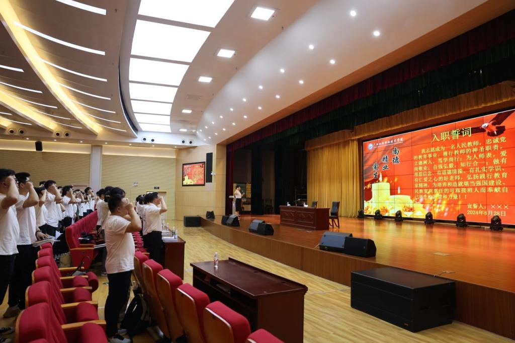 在入职宣誓环节,全体新教员工庄严宣誓,表达了忠诚党的教育事业,为人师表,爱岗敬业,自强弘毅,知行合一,为培养和造就堪当强国建设、民族复兴重任的可靠接班人而奉献自己毕生的智慧和力量。