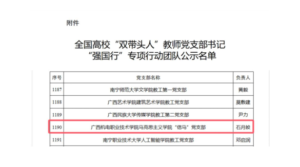 下一步,学校党委将以成功入选全国高校“双带头人”教师党支部书记“强国行”专项行动团队为契机,加快党支部内涵式特色化发展,不断强化“双带头人”工作室的建设,充分发挥“头雁”效应,强化党建引领,加快建设“广西领先、国内一流、国际知名高水平智能制造特色校”,引导全校师生在以中国式现代化全面推进强国建设、民族复兴伟业新征程上砥砺新担当、展现新作为。