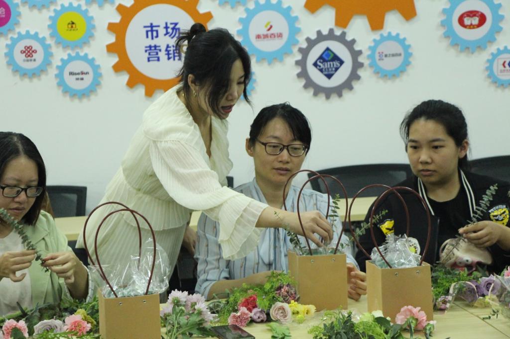 商学院工会组长黄海美老师首先代表学院工会对全院女教职工致以节日的问候。随后,花艺老师用诙谐幽默的语言为大家介绍鲜花常识、插花艺术的基本花型、花色搭配及插花技巧等知识,并通过实际操作的形式将中国传统的插花艺术生动地展现在每位老师面前。在场教职工兴趣盎然,参与度极高,纷纷与老师交流互动学习,气氛热烈,并在花艺老师的指导下尝试各种构思、修剪、造型,制作自己的插花作品。