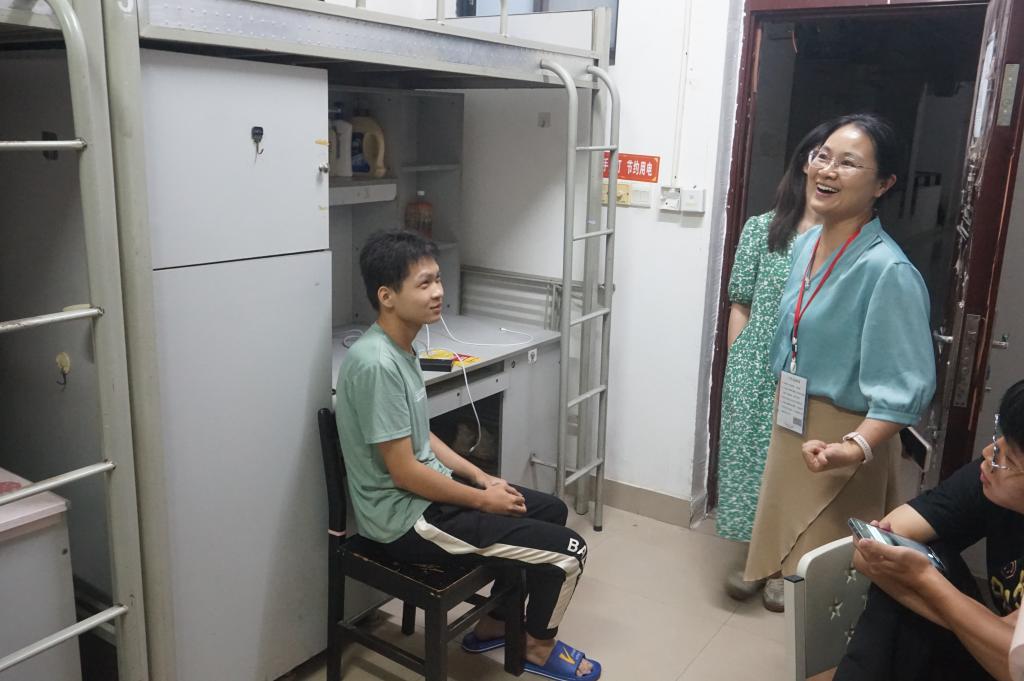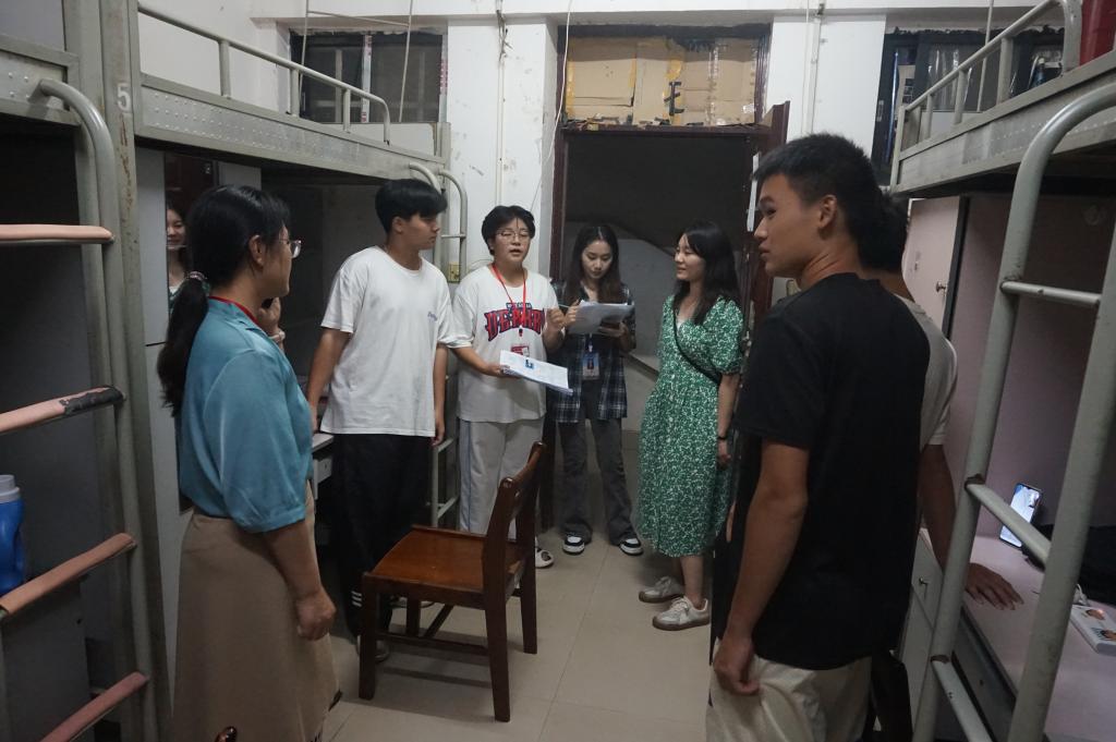 晚上,商学院党委书记谢平芳、学工办公室主任陈秋利带领2023级辅导员深入学生宿舍,到宿舍区看望、慰问新生,与新生亲切交流,排查安全隐患,处理新生突发事件。