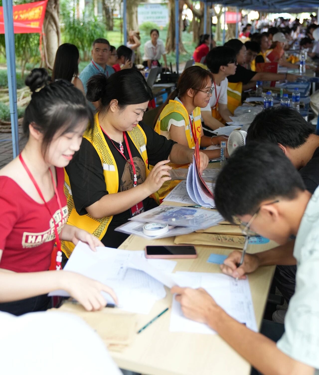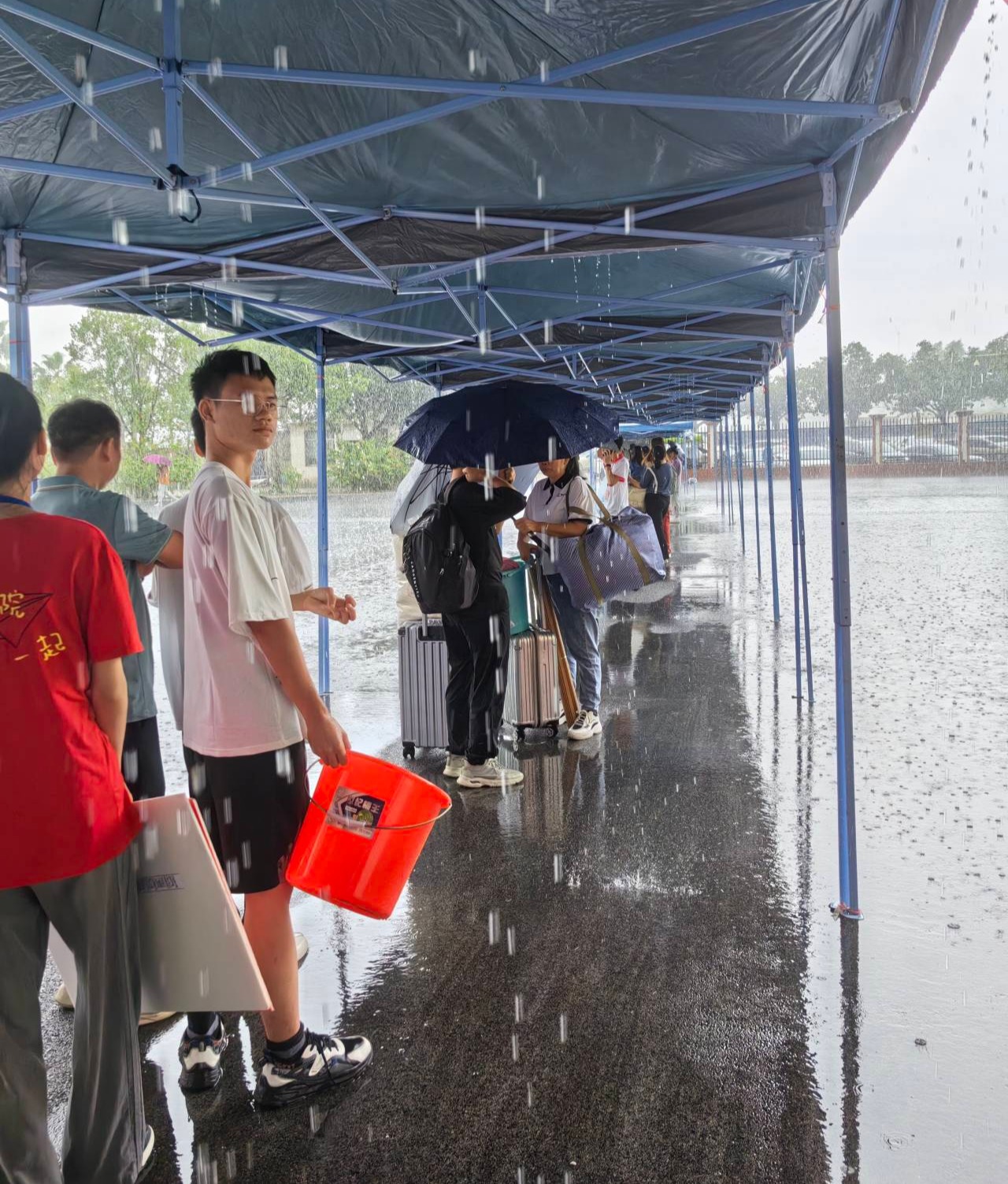 受台风影响,上午11时思源湖校区出现较强降雨。商学院迎新工作人员和志愿者不惧风雨、全力以赴,积极维护秩序,协助搬运行李,优化报到流程,耐心为新生答疑解惑,确保迎新工作安全顺利有序进行。