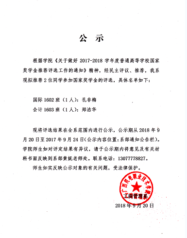 《关于做好2017-2018学年度普通高等学校国家奖学金推荐评选工作的通知》公示