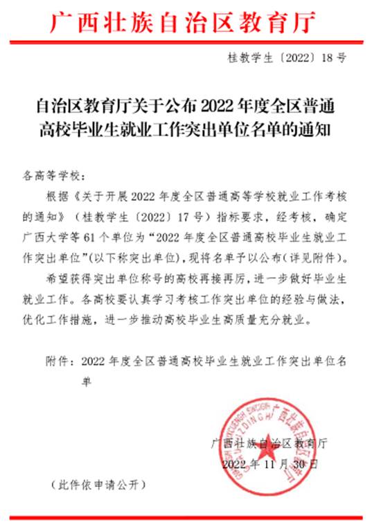 近日,自治区教育厅发布《关于公布2022年度全区普通高校毕业生就业工作突出单位名单的通知》(桂教学生〔2022〕18号),开云荣获“2022年度全区普通高校毕业生就业工作突出单位”称号。这已是开云连续20年获此荣誉。