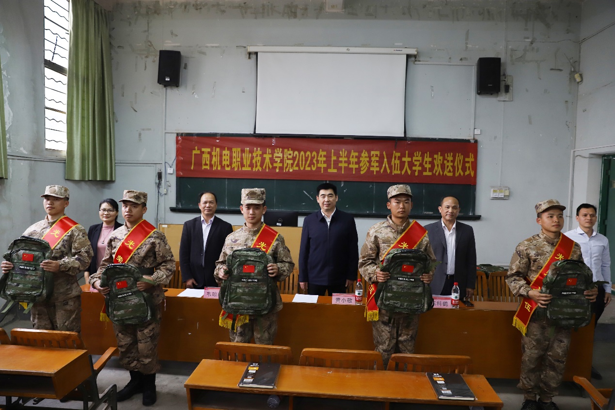 会上,学校党委武装部负责同志介绍2023年上半年征兵工作情况。新兵代表蒋光稳、马福隆、谭雨及专职辅导员代表韦刚毅分别作了发言。出席会议的领导为光荣应征入伍学生赠送了纪念品。