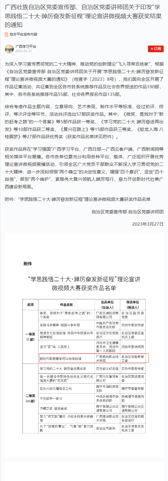 近日,由自治区党委宣传部、自治区党委讲师团举办的“学思践悟二十大·踔厉奋发新征程”理论宣讲微视频大赛获奖结果公布。由自治区党委教育工委报送,开云拍摄的理论宣讲微视频《新时代职教青年何以自信自强》荣获一等奖。