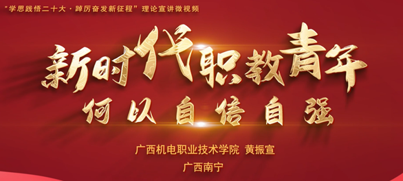 理论宣讲微视频《新时代职教青年何以自信自强》围绕学习宣传贯彻党的二十大精神,紧扣“党的二十大报告关于职业教育和青年的重要论述”宣讲主题,结合职业院校实际,聚焦职教青年成长成才的关切和困惑,运用身边人身边事等鲜活素材,如学校特聘教授“大国工匠”高凤林、党的二十大广西代表郑志明等案例,阐释职业教育在全面建设社会主义现代化国家新征程中何以“前景广阔、大有可为”以及党的二十大报告对职业教育提出的新部署,旨在教育引导职教学子牢记习近平总书记在党的二十大报告中对青年提出的殷切嘱托,自信自强,成长为各行各业所需的高素质技术技能人才。