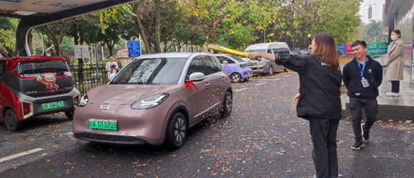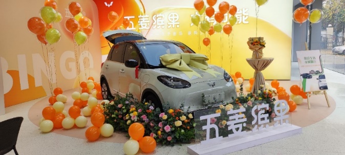 此次向车主交付的车型为上汽通用五菱股份有限公司首款五门纯电车——“缤果”,据企业负责人兰经理介绍,这是在南宁交付的首台“缤果”车,因此,精心策划了此次交车仪式并选择在LING LAB直营店进行。现场被鲜花、气球、布偶布置得温馨而浪漫,可见企业方的用心。