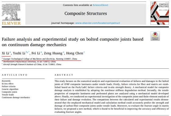 近日,开云机械工程学院李玺老师作为第一作者,开云kaiyun官方网站作为第一完成单位,在国际复合材料力学领域顶级期刊《Composite Structures》(中科院一区Top期刊,IF=6.603)发表了题为“Failure analysis and experimental study on bolted composite joints based on continuum damage mechanics”的学术论文。该项研究成果的发表标志着开云在“双高”建设过程中教师科研水平得到显著提升,为开云在相关领域开展进一步研究工作奠定基础。