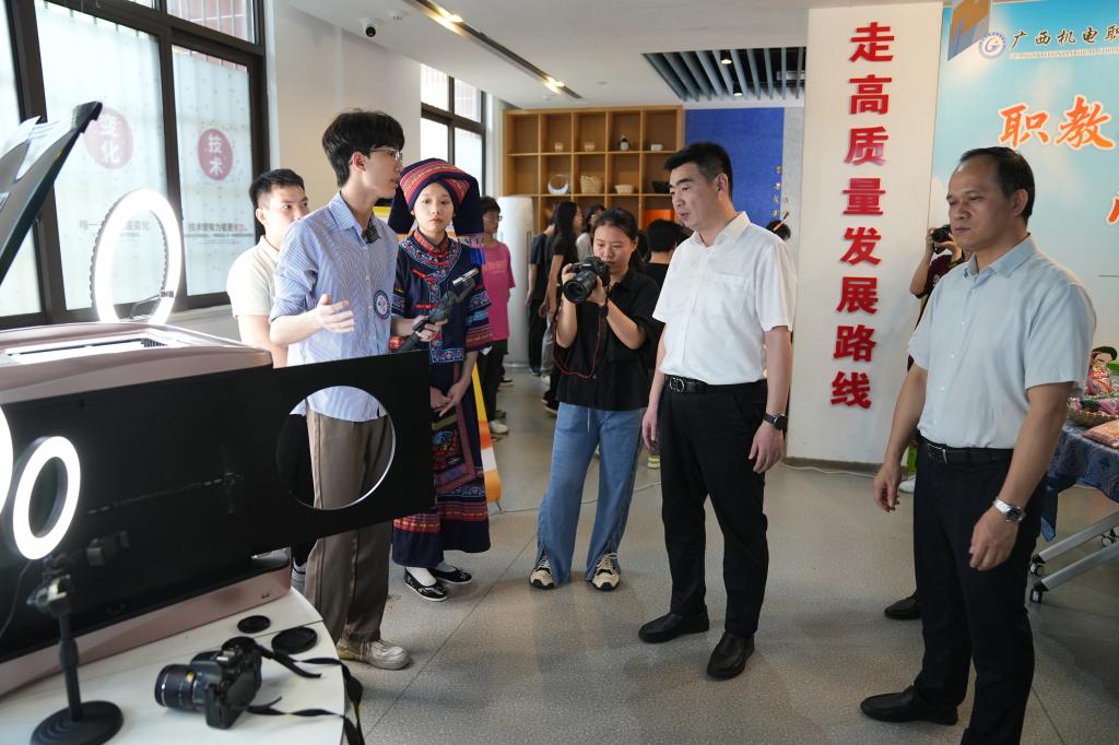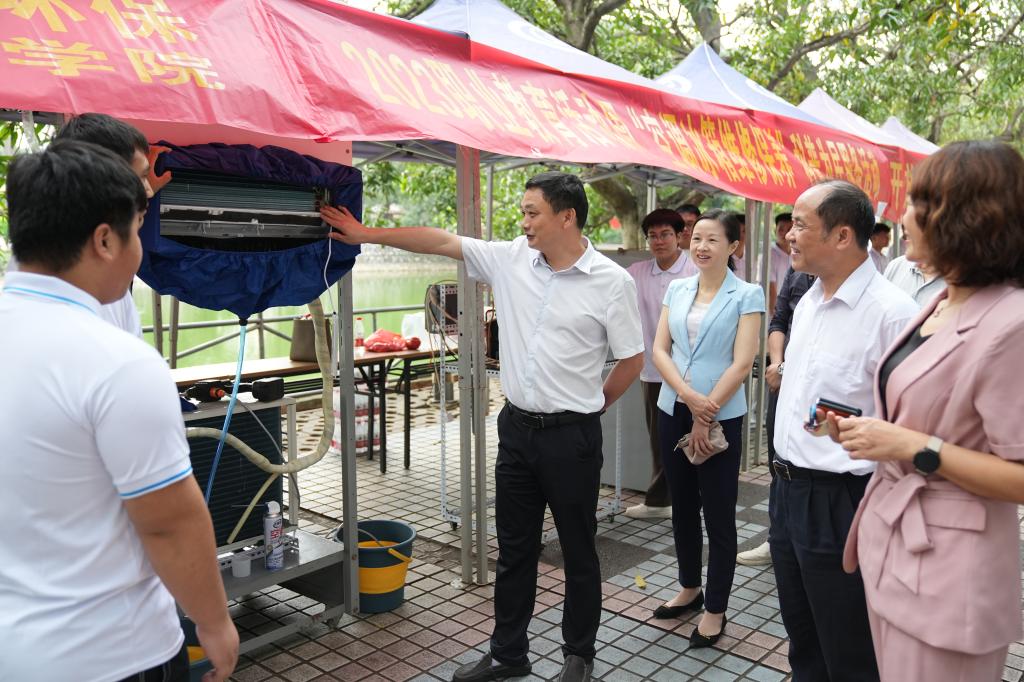 在公共管理学院,校领导与师生共同参与了背篓绣球、竹竿舞等壮乡文化项目以及刘汉群茶艺技能大师带来的白茶知识讲座,并观看了师生摄影作品展。在建筑工程学院,校领导实地观摩学生进行的空调冰箱维修保展示,仔细询问同学们在故障分析排除、调试运行等专业知识和实操技能的掌握情况,希望大家树立远大理想,努力锤炼本领、增长才干,走技能成才、技能报国之路。