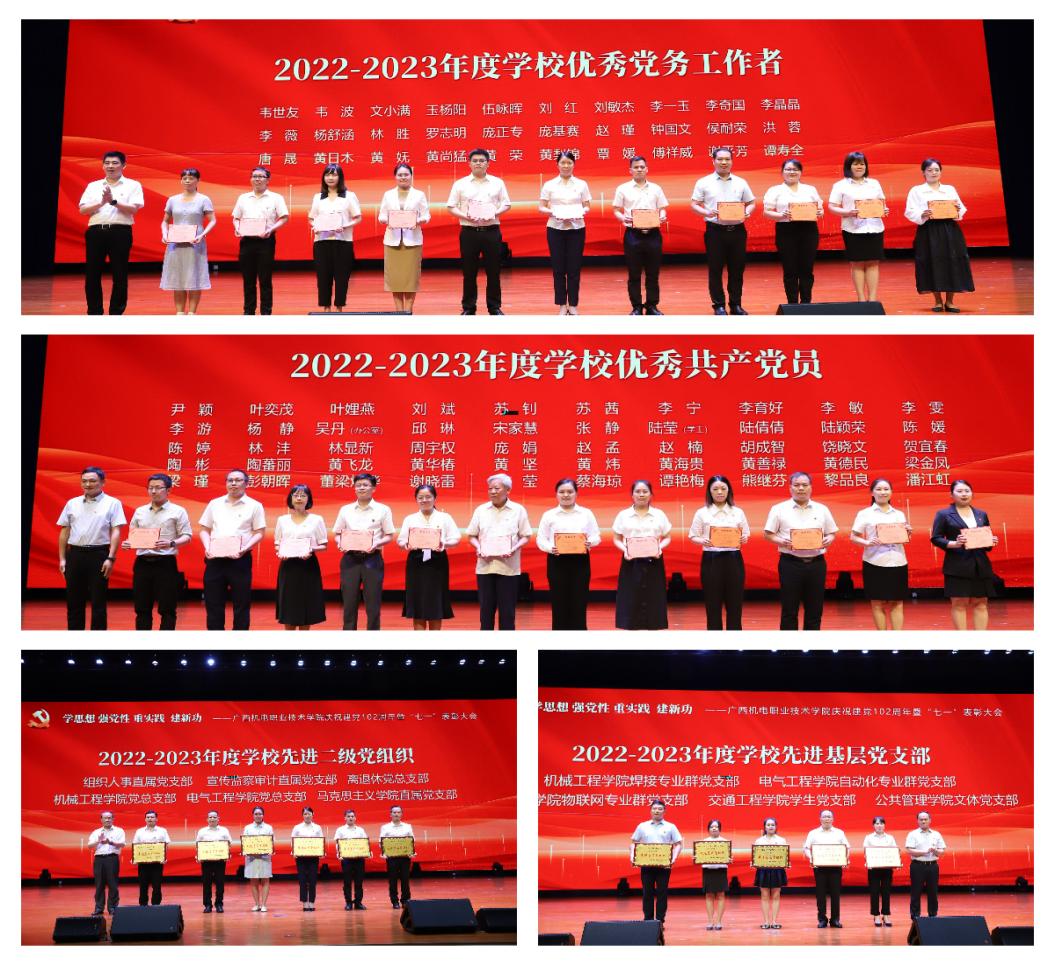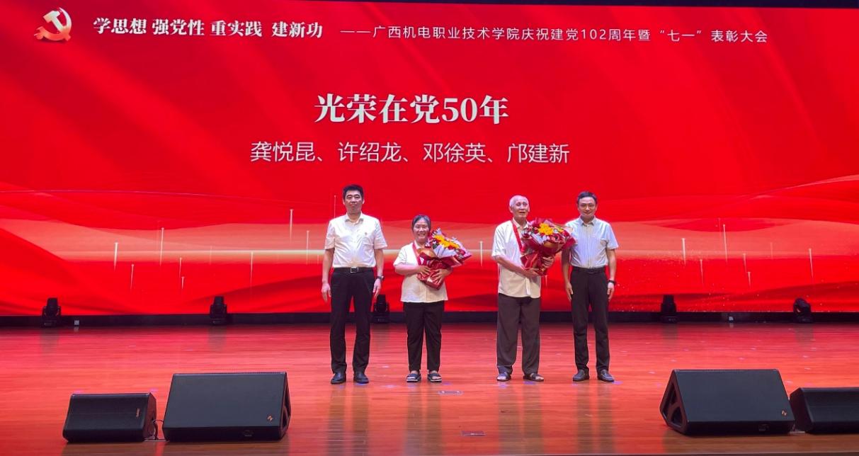 黄小敬、吴世先为离退休党员代表颁发“光荣在党50年”纪念章,今年开云有4位老同志获此殊荣。一枚枚纪念章既是对老党员一心向党、矢志不渝的崇高敬意,又是对青年党员肩负使命与担当、勇立新功的勉励和殷切期盼。会议号召学校全体党员干部,以他们为榜样,继承和发扬党的光荣传统和优良作风,弘扬伟大建党精神,以“时时放心不下”的责任感、积极担当作为的精气神,加快推进学校“双高”建设,为谱写中国式现代化广西篇章贡献力量。
