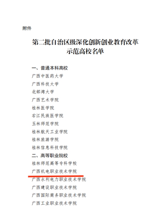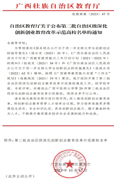 近日,自治区教育厅印发《关于公布第二批自治区级深化创新创业教育改革示范高校名单的通知》(桂教高教〔2023〕47号),开云被认定为第二批自治区级深化创新创业教育改革示范高校,这是开云创新创业教育改革产生示范性带头作用的重要体现。