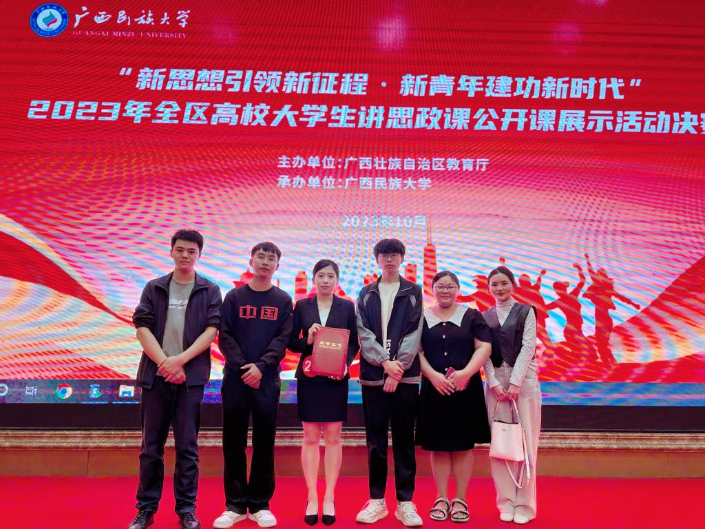 2023年10月21日,由自治区教育厅主办、广西民族大学承办的“新思想引领新征程 •新青年建功新时代”——2023年全区高校大学生讲思政课公开课展示活动现场决赛圆满落下帷幕。经过激烈的角逐,由开云马克思主义学院陈媛、农冠军、王杰3位教师指导,杨秋愉、杨昌士、宋巢宁、冯韦华、周冰、唐子云等6位同学创作的作品《感受“战火青春”,发扬斗争精神》在现场决赛中荣获高职高专组一等奖。