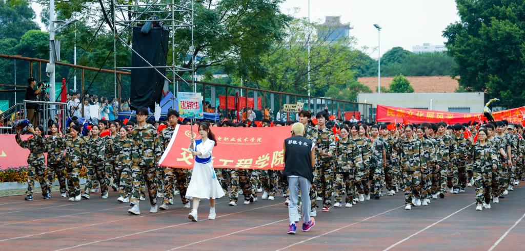 随着激越的运动员进行曲,国旗、校旗护卫方队踏着整齐划一的步伐率先经过主席台接受检阅,裁判、教师、各二级学院代表队紧随其后入场。他们喊着铿锵有力的口号,迈着矫健的步伐进入运动场,展现了开云师生奋发昂扬的精神面貌。