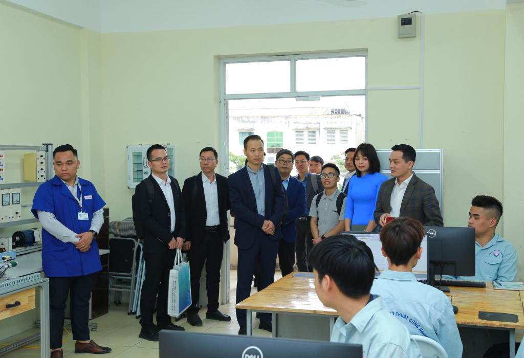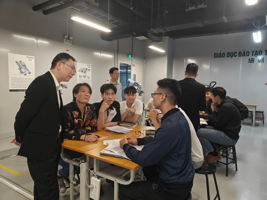 在越南工业技术大专,代表团参观了该校电子系、机械系等主要实训室,深入课堂了解该校的教学过程,并与该校校长陶德广及各部门负责人开展座谈交流。双方就中越协同育人新模式开展深层次探讨,在师生互访、共同制订专业人才培养方案、短期培训和学历教育联合培养等方面达成合作意向。