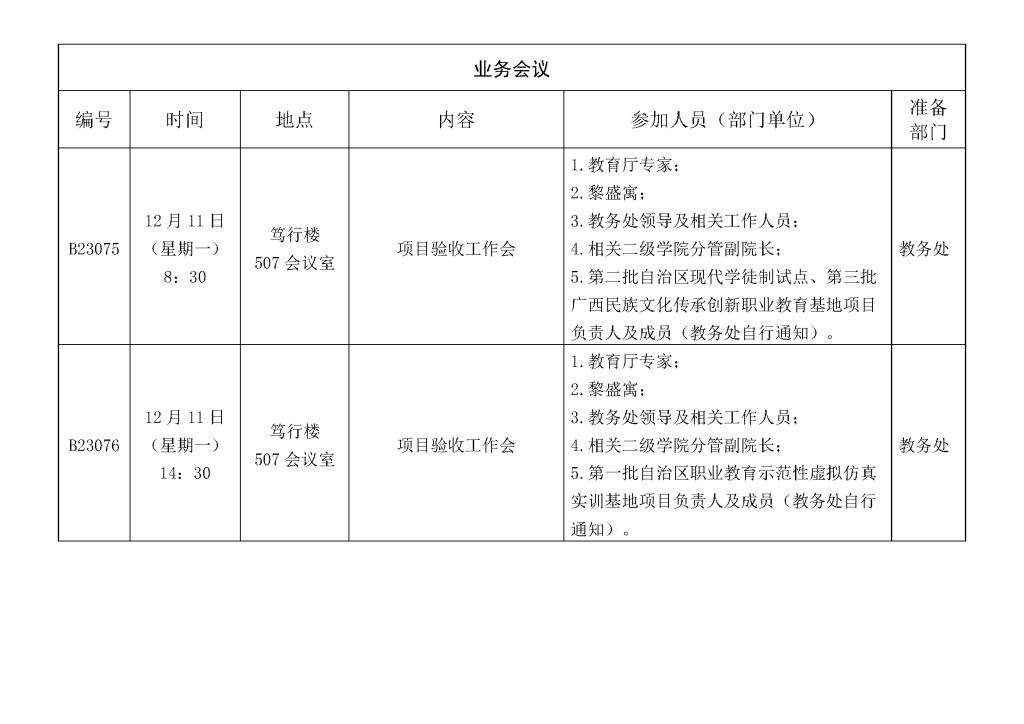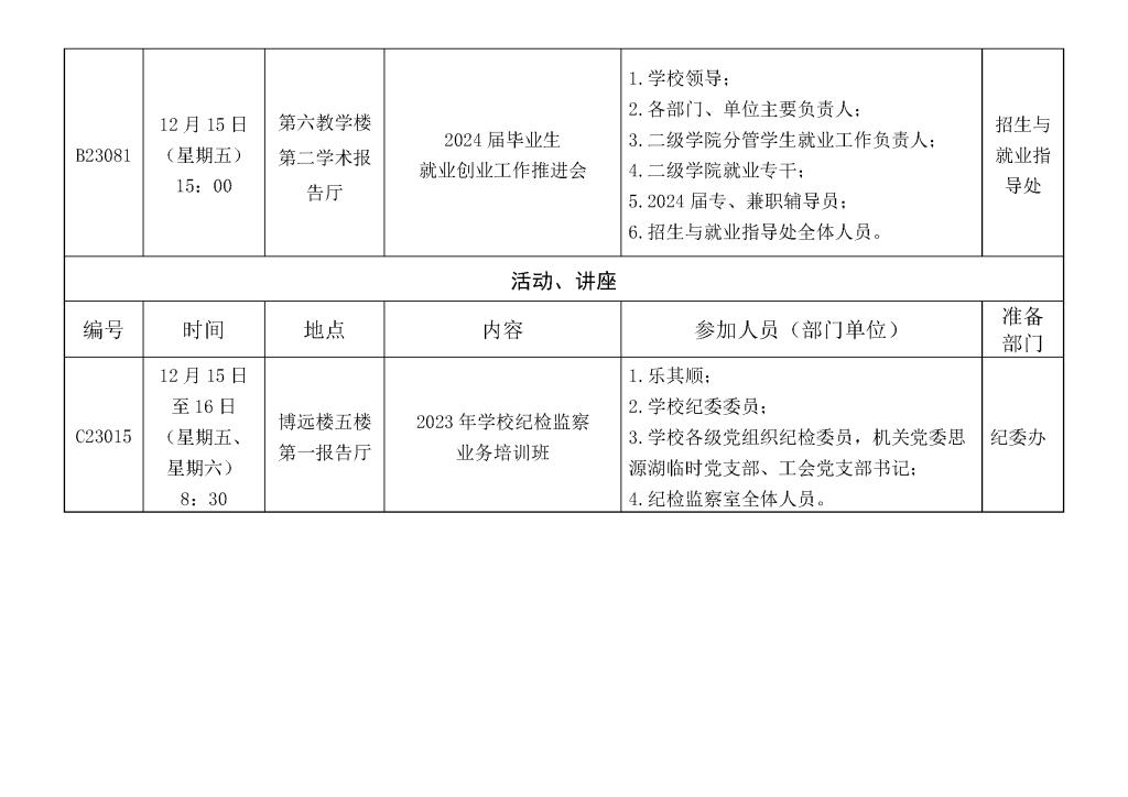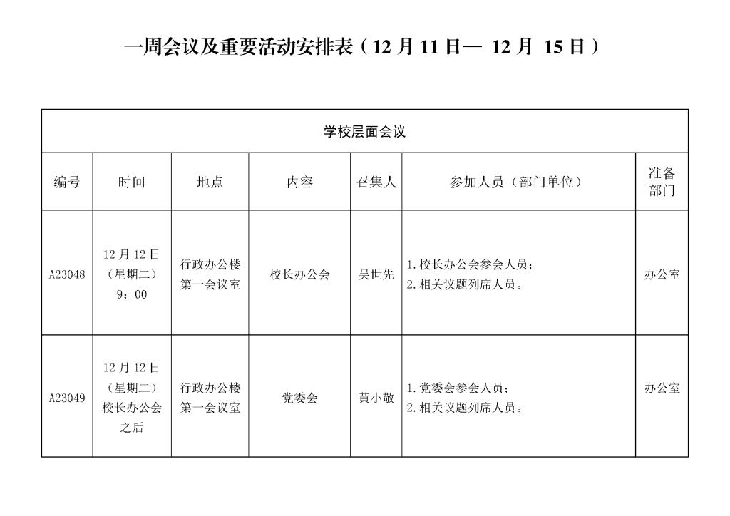 一周会议及重要活动安排表(12月11日— 12月 15日)