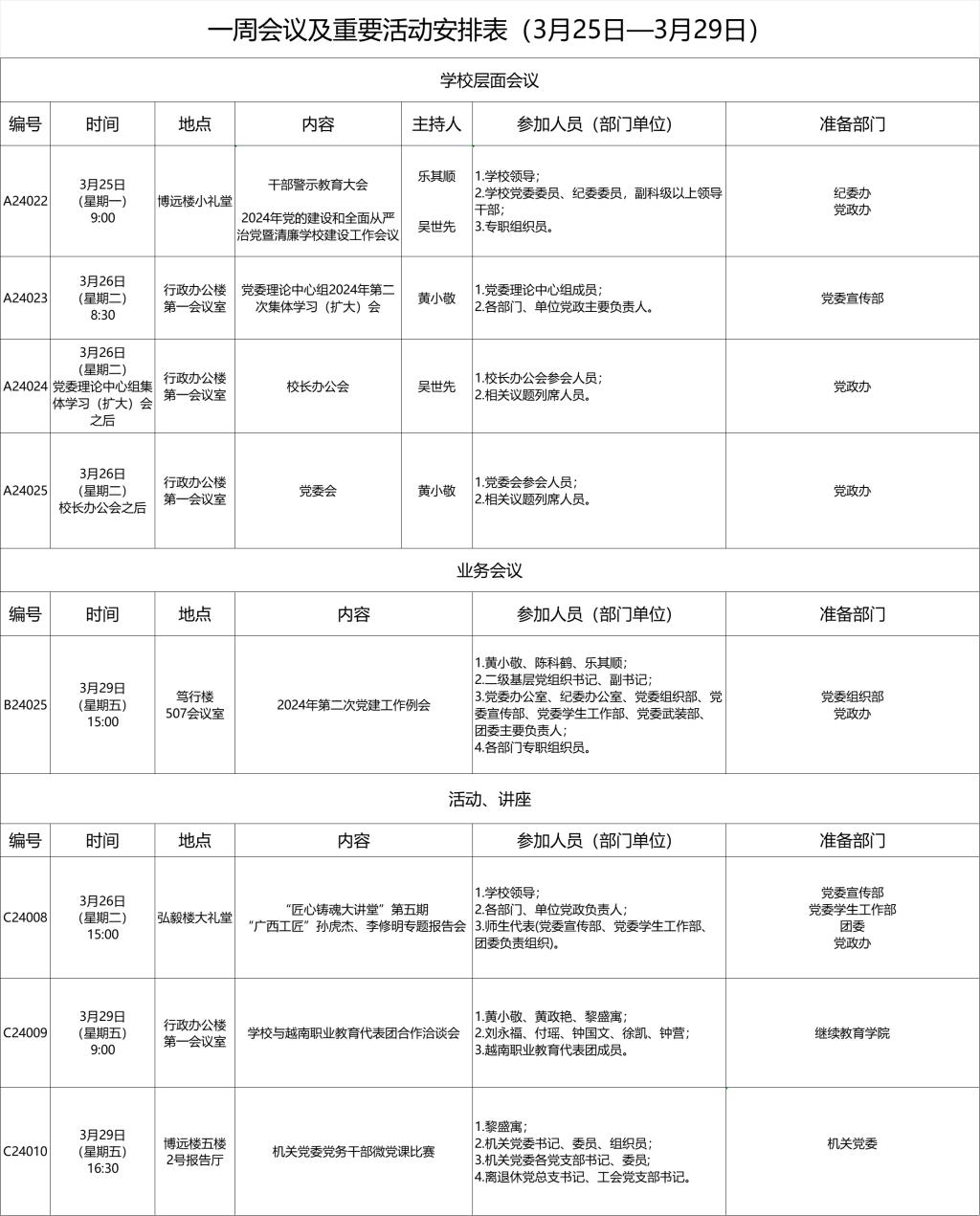 一周会议及重要活动安排表(3月25日—3月29日)