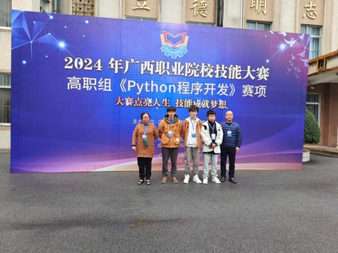 2024年3月10日,由自治区教育厅主办的广西职业院校技能大赛高职组《Python程序开发》赛项在南宁举行,来自广西35所高职院校的99位选手同台竞技。信息工程学院人工智能专业三名同学谢鹏、肖洋在指导老师林沣、蒋桂文、黄蓓静的悉心指导下,在此项赛项中脱颖而出,其中谢鹏获一等奖,肖洋获三等奖。