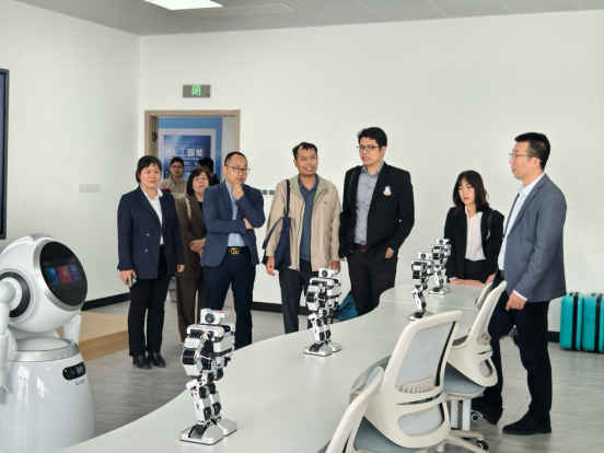 会后,泰方代表团前往人工智能新质生产力培育基地参观。在AR/VR体验区,代表团体验了虚拟汽车控制、智能体感游戏等趣味应用;智能机器人展演区同步呈现舞蹈编程秀,多台人形机器人随音乐节拍完成协同动作编排,其灵活的动作控制获得代表团一行连连赞许。