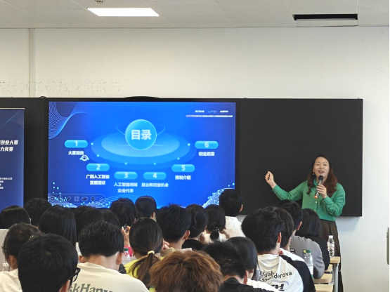 活动伊始,学院党委副书记覃媛率先发表动员讲话。她强调,在人工智能加速渗透各行业的当下,本次宣讲会既是对接区域产业发展需求的重要桥梁,也是为学生搭建的“学思践悟”平台,希望同学们能珍惜机会,深入了解AI技术应用与创业竞赛要点,为未来发展积蓄力量。