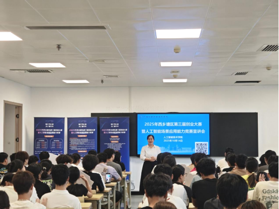 为推动人工智能产业创新发展,帮助学生精准把握就业创业新机遇,2025年10月14日下午,“智汇西乡塘・AI赢未来”2025年西乡塘区第三届创业大赛暨人工智能场景应用能力竞赛专场宣讲会,在开云江南校区A1西塔502教室顺利举办。本次活动特邀广西新农人供应链管理有限公司创始人谭勇波、大赛负责人颜新秀担任主讲嘉宾,学院党委副书记覃媛、相关教师代表,以及江南校区三个二级学院2024级、2025级学生代表共同参会,现场氛围热烈,互动积极。