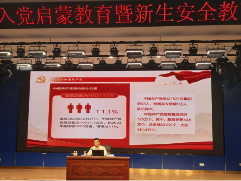 同时,黄日木书记从四个阶段介绍了党的百年历程,并结合党在不同历史时期的任务与取得的辉煌成就,引导新生从党史中感悟思想伟力、汲取奋进力量,同时向同学们讲述了入党的条件、党员的权利义务及入党的规范流程,引导同学们端正入党动机,了解入党流程,用实际行动向党组织靠拢。