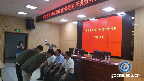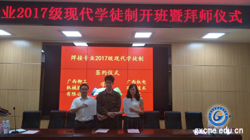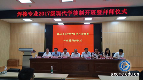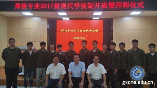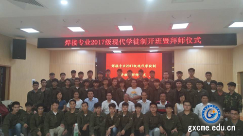 9月26日下午,我院在学院博远楼第二报告厅举行“焊接17学徒班”开班暨拜师仪式。学院副院长陈勇、南宁市焊接协会理事长戴建树、柳工装载机公司构件工厂厂长冯国雄、柳工挖掘机公司柳州分公司副总经理姚正锋、柳工挖掘机公司人力资源部高级经理张红艳、柳工装载机公司人力资源部经理陆萍、柳工挖掘机公司技能大师廖国锋以及教务科研处,机械工程系相关负责人和焊接专业团队教师及焊接17学徒班全体学徒参加仪式。