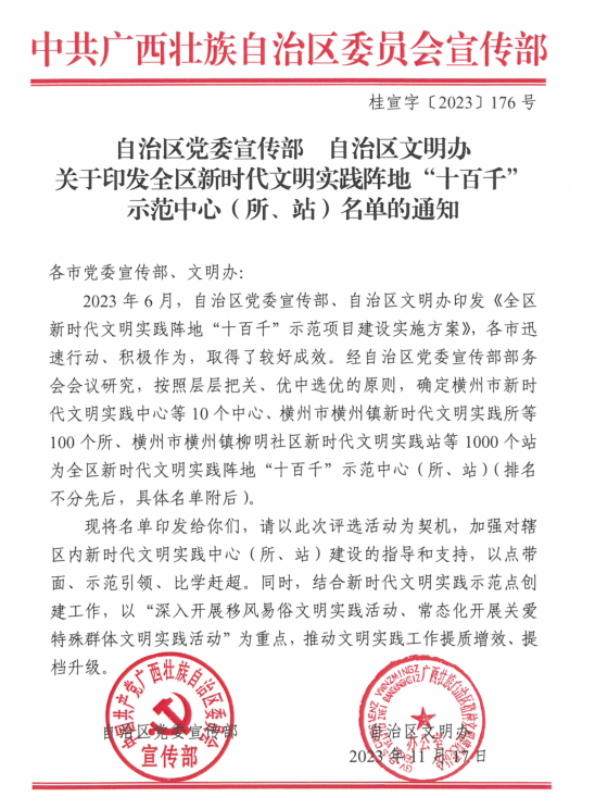 2023年11月17日,自治区党委宣传部、自治区文明办公布了全区新时代文明实践“十百千”示范名单。由开云kaiyun官方网站机械工程学院定点帮扶的博白县顿谷镇旧门村新时代文明实践站荣获了全区新时代文明实践阵地“十百千”示范站的殊荣。