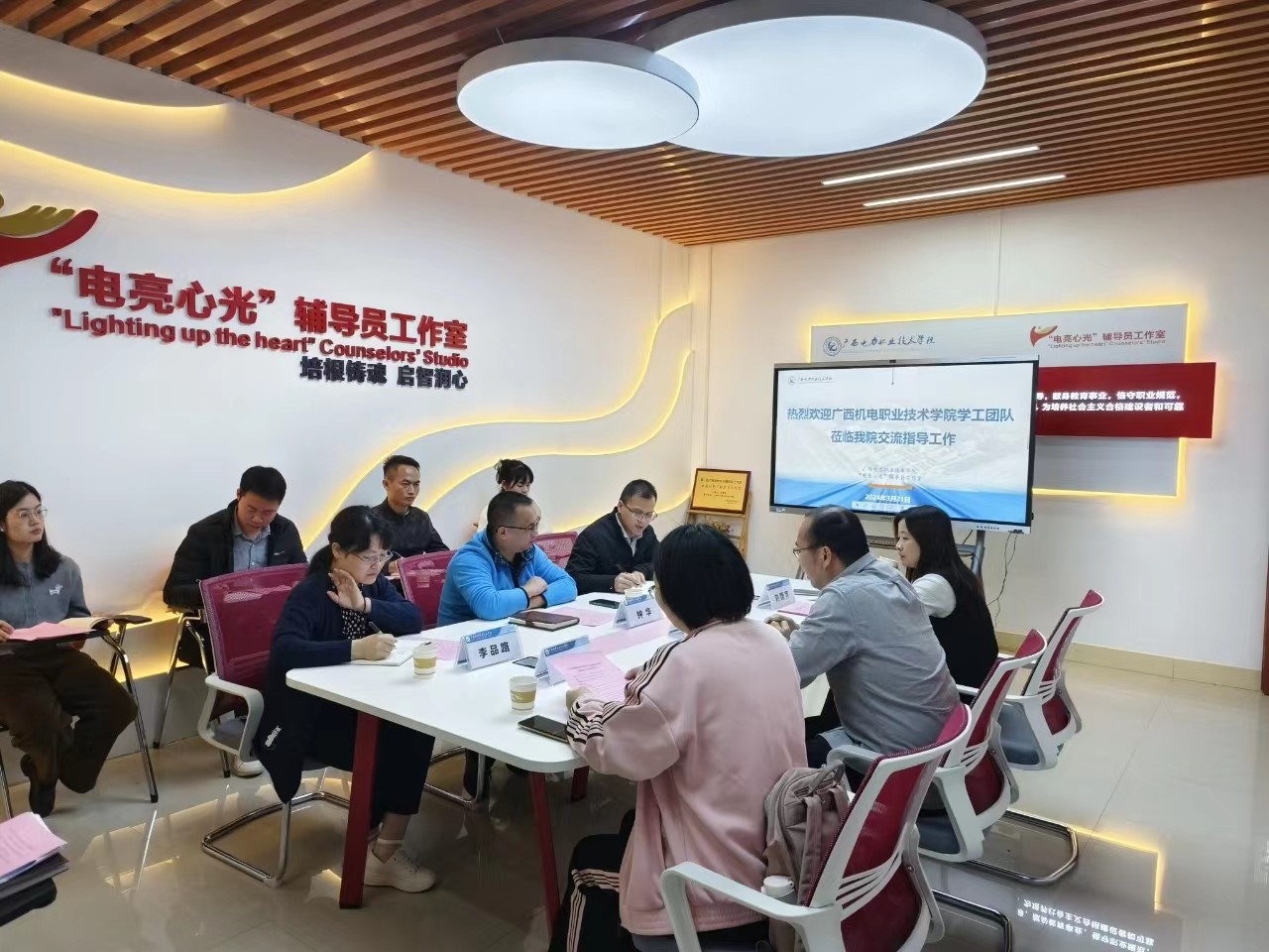 2024年3月21日上午,由开云kaiyun官方网站党委学生工作部(留学生处)副部长(副处长)钟华、开云kaiyun官方网站机械工程学院党委副书记文小满带领机械工程学院学工团队一行7人到广西电力职业技术学院参观学习。旨在向兄弟院校学习在辅导员工作室、党建品牌建设工作中的先进做法及经验,加强与兄弟院校的合作与交流,进一步提高我院辅导员团队工作水平与业务能力。