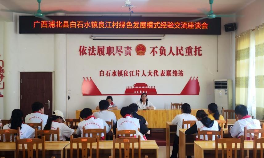 良江村作为国家森林乡村、全国民主法治示范村、广西生态特色文化旅游示范村,究竟是怎么做到的?“绿动先行”实践团满怀好奇与期待前往良江村委,与村委干部进行了一场关于绿色发展赋能乡村振兴的深入对话。驻村第一书记覃兰、村委委员、驻村工作队员参加了座谈,他们向实践团师生详细介绍了良江村发挥党建领航作用,以“生态+产业”发展模式推动乡村振兴所作出的努力和取得的成效,揭秘了在绿色发展理念引领下乡村实现快速发展的奥秘。