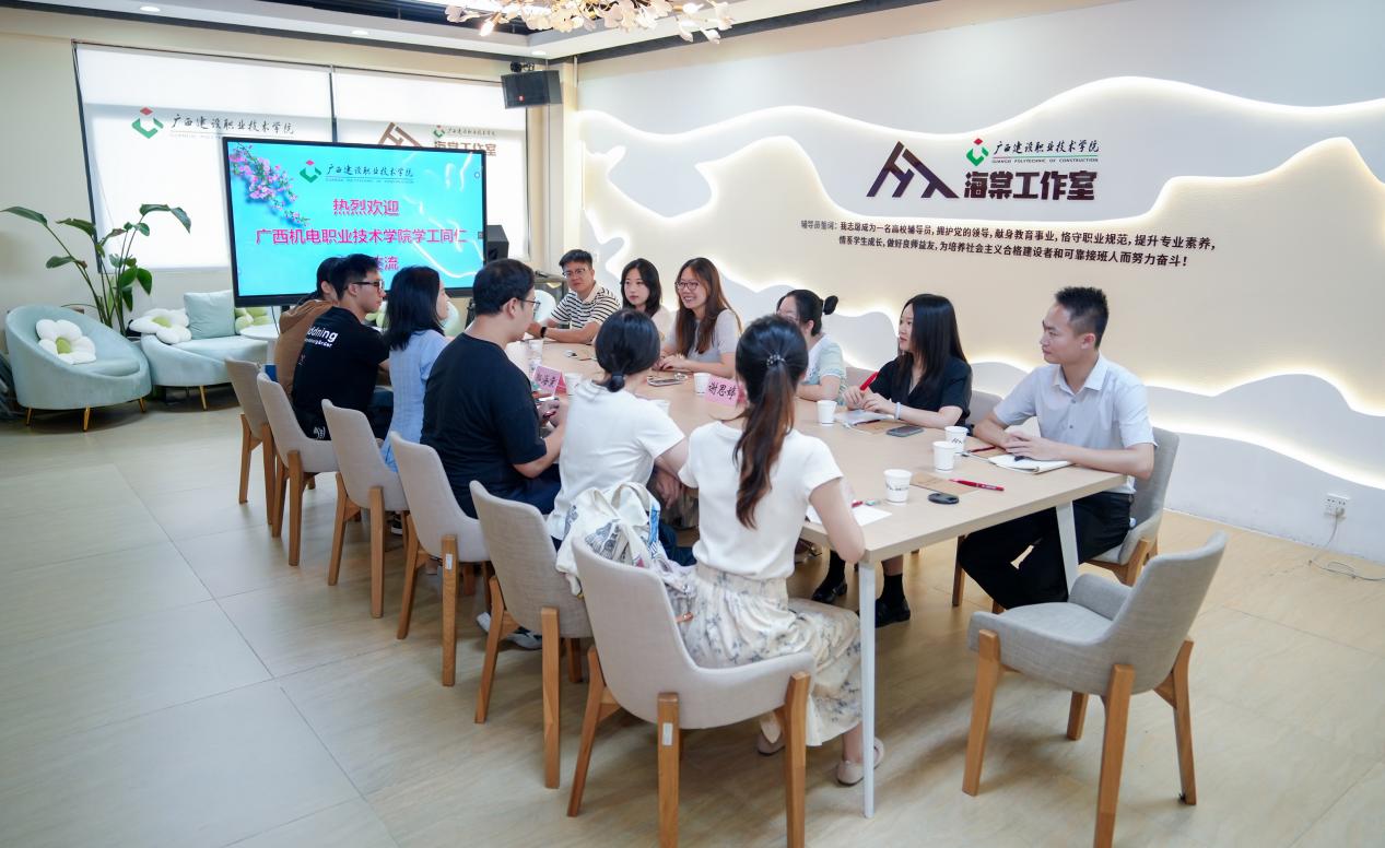 为进一步加强辅导员工作室建设,提升辅导员队伍的职业能力和专业化水平,7月9日,我院党委副书记刘靖怡率学生工作团队一行10人赴广西建设职业技术学院“海棠工作室”交流学习。管理工程学院党总支副书记、海棠工作室主持人郭海棠对我院一行表示欢迎,并给予了热情接待。