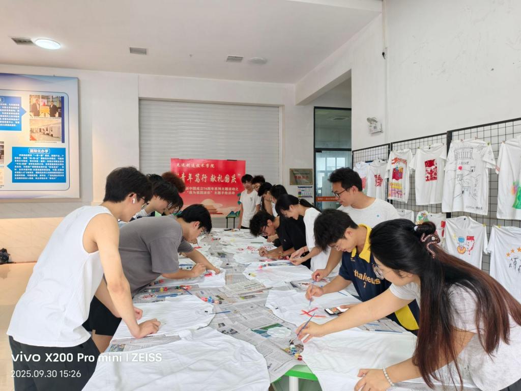 9月30日,在国庆系列活动之“我为祖国添彩”现场手绘活动中,学生们迫不及待地拿起画笔和颜料,将对祖国的热爱与祝福凝注于主题文化衫的创作中。每一件文化衫的绘制都是一堂生动的爱国教育实践课,青年学生在一笔一画中厚植家国情怀,在色彩碰撞中彰显文化自信。活动结束后,同学们纷纷表示在国庆到来之际制作这些手绘作品很有意义。部分优秀作品在学校笃行楼一楼展出期间,吸引了经过的老师、同学驻足观赏。