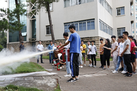 随着警报声的响起,消防安全演练开始。工作人员第一时间赶到指定位置,协助学生快速、有序地撤离,各辅导员和保卫处工作人员带领学生弯着腰,捂住鼻口,沿指定路线迅速撤离至安全地带。随即,老师清点学生人数,确保学生无一人滞留,并向上层层汇报。不到5分钟时间,全部师生安全撤离,整个过程紧张有序。在消防逃生疏散演练结束后,潘荣军老师指导同学们进行消防灭火实践体验,老师和同学们亲身操作灭火器进行了演练。本次活动,进一步增强了师生的消防安全意识,提高了师生紧急逃生的能力,营造了安全、稳定、和谐的校园环境。