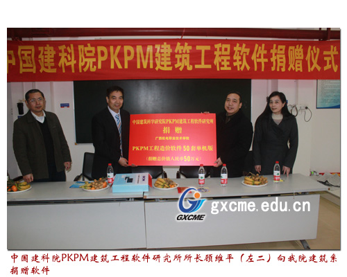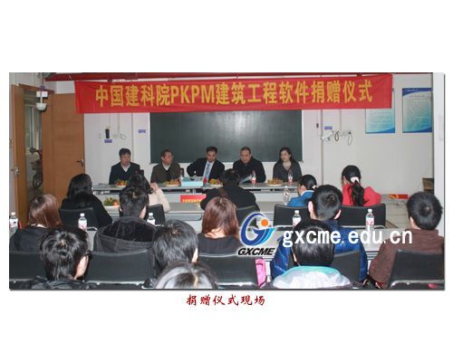 2012年3月13日下午,中国建筑科学研究院PKPM建筑工程软件研究所工程造价软件捐赠仪式在图书馆一楼建筑工程系会议室举行。中国建筑科学研究院PKPM建筑工程软件研究所所长顾维平、PKPM建筑工程软件广西负责人徐群清与建筑系领导共同出席了本次捐赠仪式。建筑系近50名师生代表参加了捐赠仪式。顾维平所长代表中国建科院PKPM建筑工程软件研究所向建筑工程系捐赠了市场价值达50万人民币的50套PKPM建筑工程软件。