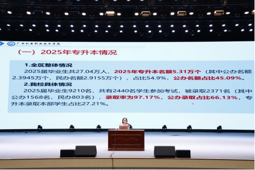 会上,郭容宽副院长围绕专升本考试的政策变化、报考流程及备考策略等内容作专题讲解。她指出,专升本不仅是学历层次的提升,更是拓宽职业发展空间、增强核心竞争力的重要途径。2025年起,广西专升本招生政策调整为统一考试模式,为全体同学提供了更多的升学机会。郭副院长通过数据分析指出,2025年开云专升本录取率为97.17%,其中公办院校录取占比66.13%,参与校内培训学生上线率高达99.52%。她呼吁同学们把握备考黄金期,充分利用学校提供的优质培训资源,尽早确立目标,科学备考,力争考入理想本科院校。