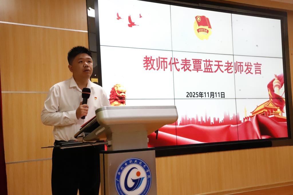 覃蓝天老师作为授课教师代表,鼓励同学们积极面对新形势和新要求,强化理论学习,加强实践锻炼,坚持用马克思主义科学理论武装头脑,树立共产主义远大理想和中国特色社会主义共同理想,为谱写中国式现代化建设的绿色新篇章贡献青春、智慧和力量。