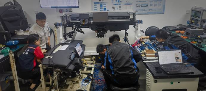 备赛过程中,团队聚焦智能网联汽车制造过程中智能系统质量检查岗位任务,结合企业调研发现的痛点,融合机电设备技术与软件技术,创新开发出“智能传感器自检平台”(针对智能驾驶系统)与“智能座舱总成电检系统”(针对智能座舱)。这两项成果有效解决了传统手工质检效率低、易漏检、一致性差、问题排查复杂耗时等行业难题。