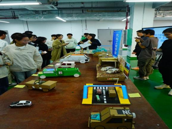 本次竞赛以 “创新驱动・绿色智造” 为核心理念,紧密衔接吉利汽车 “人才森林” 校企合作战略,设置三大竞赛板块精准对接实践教学需求。在废旧材料汽车拼贴画展区,瓶盖拼接的轮毂、纸箱板剪裁的车身、吸管组装的排气系统构成了一幅幅 “环保汽车” 图景,将绿色制造理念具象化呈现;创意模型制作区里,超轻黏土塑造的未来概念车线条流畅,车灯、格栅等细节雕琢精致,部分作品还融入了智能座舱的创意构想;3D 立体场景搭建现场更具巧思,参赛团队用卡纸搭建的城市交通系统中,手工汽车模型精准还原 “礼让行人” 场景,红绿灯、斑马线等元素尽显安全出行意识。