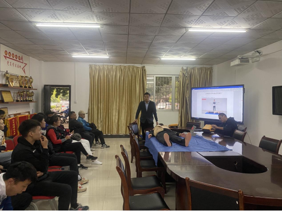 公共管理学院卓倪副院长、体育骨干教师段翊君老师到场动员培训,卓倪副院长身先示范,带头练习心肺复苏的每一个操作流程,认真领会技术要领并亲自作为学员参与培训,全程监督培训考核情况。全体专兼职体育教师参加培训。