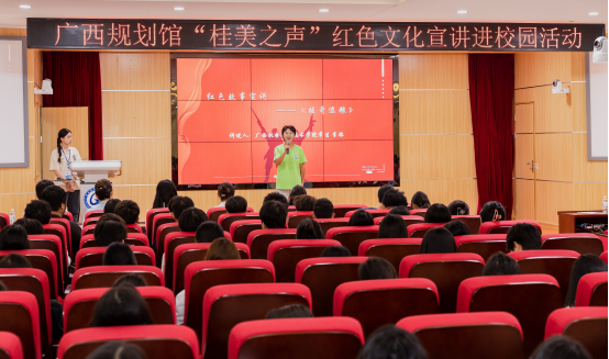 活动现场,广西规划馆“桂美之声”宣讲团成员围绕党史学习教育、中国共产党人精神谱系等内容,讲述了《忠诚界碑护边关》、《岁月无疆,英雄不朽》等感人的红色故事,帮助学生“扣好人生第一粒扣子”,让红色精神真正入脑入心。我院学生代表李熔结合前往东兰参加暑假三下乡社会实践活动的所见所闻,讲述了流传在东兰一代的红色故事《拔哥退粮》,生动再现了韦拔群同志不怕牺牲、敢于拼搏的精神。