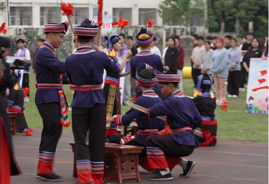 流传于广西马山、都安等地的传统民俗——打扁担、壮族三大乐器中最古老的乐器之一——天琴表演、国家级非物质文化遗产——铜鼓舞、具有悠久历史的壮族嘹啰山歌与火爆全网的“广西科目三”碰撞出新时代的火花,一段段蕴含着丰富民族文化内涵的表演引得现场师生喝彩不断。鲜为人知的是,这一场演出竟然是旅游管理专业民族歌舞实训课程的课程作业!