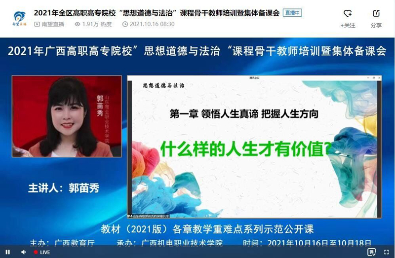 此次培训采用线上与线下相结合的方式,部分省外专家在“云端”授课,为广西同行传经送宝,与现场学员交流互动,实现跨空间无障碍交流。同时,培训采用全程直播的模式面向广大思政课同行,突破了以往培训受众面窄、受益者不多的局限,培训期间在线观看浏览量达到3万人次,广泛辐射到区内外高职高专院校,受到同行的肯定和好评。